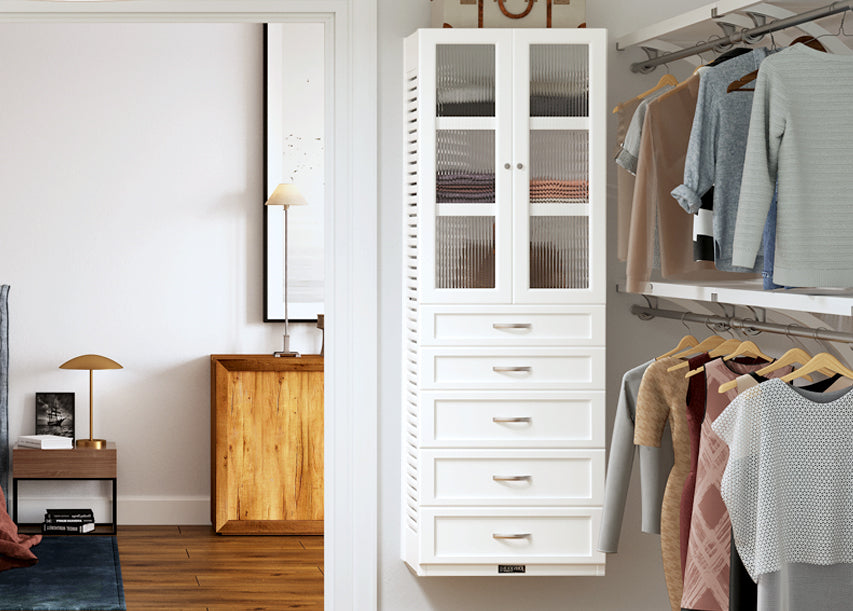 This provides a comprehensive solution to meet your needs, giving you plenty of shelving and hanging space. Plus, choose between elegant glass or solid panel doors to cover adjustable shelves and create a truly custom look that suits your personal taste. You can even use this durable storage unit outside your closet – it's perfect for bathrooms, laundry rooms, offices, and more, offering incredible customization and functionality throughout your entire home.
